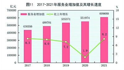 全年批發(fā)和零售業(yè)增加值110493億元,比上年增長11.3%;交通運(yùn)輸、倉儲(chǔ)和郵政業(yè)增加值47061億元,增長12.1%;住宿和餐飲業(yè)增加值17853億元,增長14.5%;金融業(yè)增加值91206億元,增長4.8%;房地產(chǎn)業(yè)增加值77561億元,增長5.2%;信息傳輸、軟件和信息技術(shù)服務(wù)業(yè)增加值43956億元,增長17.2%;租賃和商務(wù)服務(wù)業(yè)增加值35350億元,增長6.2%。全年規(guī)模以上服務(wù)業(yè)企業(yè)營業(yè)收入比上年增長18.7%,利潤總額增長13.4%。(見圖11)