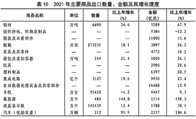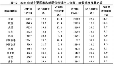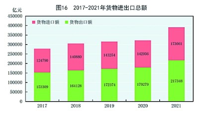 全年貨物進(jìn)出口總額391009億元,比上年增長21.4%。其中,出口217348億元,增長21.2%;進(jìn)口173661億元,增長21.5%。貨物進(jìn)出口順差43687億元,比上年增加7344億元。對“一帶一路”[44]沿線國家進(jìn)出口總額115979億元,比上年增長23.6%。其中,出口65924億元,增長21.5%;進(jìn)口50055億元,增長26.4%。(見圖16)(見表9)(見表10)(見表11)(見表12)