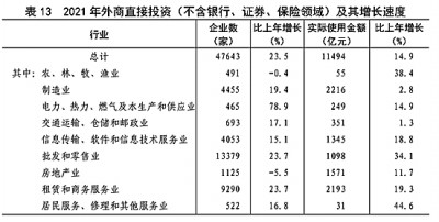 全年外商直接投資(不含銀行、證券、保險(xiǎn)領(lǐng)域)新設(shè)立企業(yè)47643家,比上年增長23.5%。實(shí)際使用外商直接投資金額11494億元,增長14.9%,折1735億美元,增長20.2%。其中“一帶一路”沿線國家對華直接投資(含通過部分自由港對華投資)新設(shè)立企業(yè)5336家,增長24.3%;對華直接投資金額743億元,增長29.4%,折112億美元,增長36.0%。全年高技術(shù)產(chǎn)業(yè)實(shí)際使用外資3469億元,增長17.1%,折522億美元,增長22.1%。(見表13)