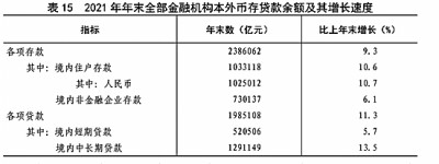 全年社會(huì)融資規(guī)模增量[45]31.4萬億元,按可比口徑計(jì)算,比上年少3.4萬億元。年末社會(huì)融資規(guī)模存量[46]314.1萬億元,按可比口徑計(jì)算,比上年末增長10.3%,其中對實(shí)體經(jīng)濟(jì)發(fā)放的人民幣貸款余額191.5萬億元,增長11.6%。年末全部金融機(jī)構(gòu)本外幣各項(xiàng)存款余額238.6萬億元,比年初增加20.2萬億元,其中人民幣各項(xiàng)存款余額232.3萬億元,增加19.7萬億元。全部金融機(jī)構(gòu)本外幣各項(xiàng)貸款余額198.5萬億元,增加20.1萬億元,其中人民幣各項(xiàng)貸款余額192.7萬億元,增加19.9萬億元。人民幣普惠金融貸款[47]余額26.5萬億元,增加5.0萬億元。(見表15)