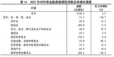 全年對外非金融類直接投資額7332億元,比上年下降3.5%,折1136億美元,增長3.2%。其中,對“一帶一路”沿線國家非金融類直接投資額203億美元,增長14.1%。(見表14)