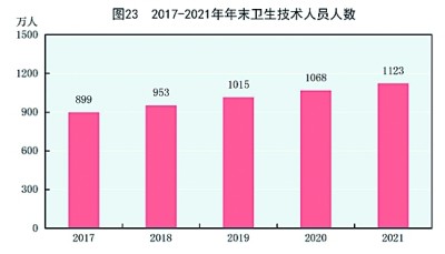 年末全國共有醫(yī)療衛(wèi)生機(jī)構(gòu)103.1萬個(gè),其中醫(yī)院3.7萬個(gè),在醫(yī)院中有公立醫(yī)院1.2萬個(gè),民營醫(yī)院2.5萬個(gè);基層醫(yī)療衛(wèi)生機(jī)構(gòu)97.7萬個(gè),其中鄉(xiāng)鎮(zhèn)衛(wèi)生院3.5萬個(gè),社區(qū)衛(wèi)生服務(wù)中心(站)3.6萬個(gè),門診部(所)30.7萬個(gè),村衛(wèi)生室59.9萬個(gè);專業(yè)公共衛(wèi)生機(jī)構(gòu)1.3萬個(gè),其中疾病預(yù)防控制中心3380個(gè),衛(wèi)生監(jiān)督所(中心)2790個(gè)。年末衛(wèi)生技術(shù)人員1123萬人,其中執(zhí)業(yè)醫(yī)師和執(zhí)業(yè)助理醫(yī)師427萬人,注冊護(hù)士502萬人。醫(yī)療衛(wèi)生機(jī)構(gòu)床位957萬張,其中醫(yī)院748萬張,鄉(xiāng)鎮(zhèn)衛(wèi)生院144萬張。全年總診療人次[70]85.3億人次,出院人數(shù)[71]2.4億人。截至年末,全國累計(jì)報(bào)告新型冠狀病毒肺炎確診病例102314例,累計(jì)治愈出院病例94792例,累計(jì)死亡4636人。全國累計(jì)報(bào)告接種新型冠狀病毒疫苗283533萬劑次。全國共有11937家醫(yī)療衛(wèi)生機(jī)構(gòu)提供新型冠狀病毒核酸檢測服務(wù),總檢測能力達(dá)到4168萬份/天。(見圖23)