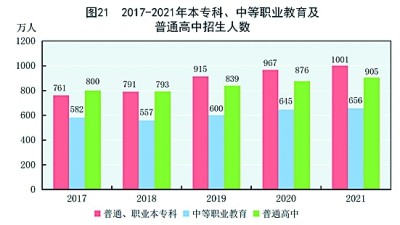 全年研究生教育招生117.7萬人,在學(xué)研究生333.2萬人,畢業(yè)生77.3萬人。普通、職業(yè)本??芠65]招生1001.3萬人,在校生3496.1萬人,畢業(yè)生826.5萬人。中等職業(yè)教育[66]招生656.2萬人,在校生1738.5萬人,畢業(yè)生484.1萬人。普通高中招生905.0萬人,在校生2605.0萬人,畢業(yè)生780.2萬人。初中招生1705.4萬人,在校生5018.4萬人,畢業(yè)生1587.1萬人。普通小學(xué)招生1782.6萬人,在校生10779.9萬人,畢業(yè)生1718.0萬人。特殊教育招生14.9萬人,在校生92.0萬人,畢業(yè)生14.6萬人。學(xué)前教育在園幼兒4805.2萬人。九年義務(wù)教育鞏固率為95.4%,高中階段毛入學(xué)率為91.4%。(見圖21)