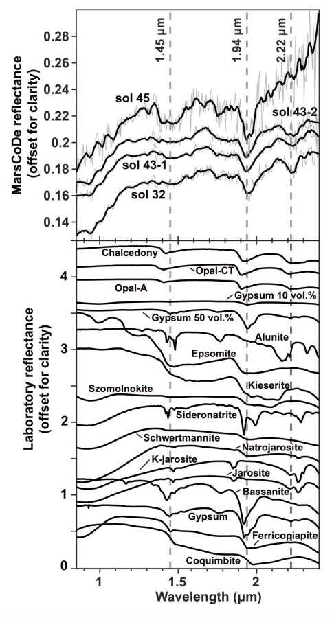 劉洋研究員和合作者通過對(duì)祝融號(hào)火星表面成分探測(cè)器獲取的短波紅外光譜和導(dǎo)航與地形相機(jī)數(shù)據(jù)進(jìn)行分析,發(fā)現(xiàn)了一種形貌上類似沉積巖的巖石類型——板狀的亮色巖石。這些板狀巖石通常部分被灰塵和土壤覆蓋,顯示出剝落的表面,表明受到熱應(yīng)力和風(fēng)成作用的物理風(fēng)化。研究人員利用短波紅外光譜在這些亮色板狀巖石中探測(cè)到了之前軌道數(shù)據(jù)在該區(qū)域沒有識(shí)別到的含水礦物,這些光譜具有~1.9μm和~2.2μm吸收特征,推測(cè)其為含水硅或含水硫酸鹽。