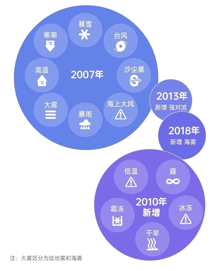 2007年,中國氣象局制定并發(fā)布《中央氣象臺氣象災害警報發(fā)布辦法(試行)》,適用于8類氣象災害預警;2010年,氣象災害預警增至13類;2013年新增強對流預警發(fā)布辦法,至此氣象災害預警增至14類。2018年,在大霧氣象災害預警中還新增了海霧預警發(fā)布辦法。