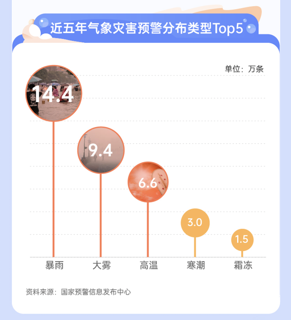 近5年,國家預警信息發(fā)布中心平均每年發(fā)布19.5萬條氣象預警信息,暴雨、大霧、高溫是發(fā)布最多的氣象災害預警。