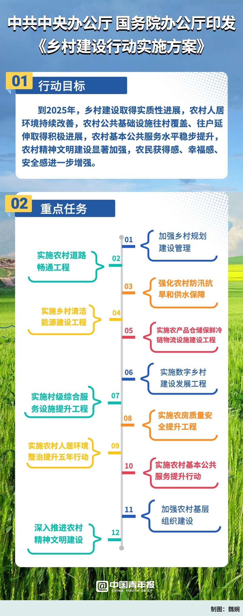 中國(guó)青年報(bào)客戶端訊(中青報(bào)·中青網(wǎng)記者 魏婉)中共中央辦公廳、國(guó)務(wù)院辦公廳近日印發(fā)的《鄉(xiāng)村建設(shè)行動(dòng)實(shí)施方案》提出,到2025年,鄉(xiāng)村建設(shè)取得實(shí)質(zhì)性進(jìn)展,農(nóng)村人居環(huán)境持續(xù)改善,農(nóng)村公共基礎(chǔ)設(shè)施往村覆蓋、往戶延伸取得積極進(jìn)展,農(nóng)村基本公共服務(wù)水平穩(wěn)步提升,農(nóng)村精神文明建設(shè)顯著加強(qiáng),農(nóng)民獲得感、幸福感、安全感進(jìn)一步增強(qiáng)。