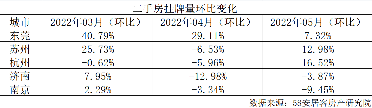 不過,安居客數(shù)據(jù)顯示,5月,東莞市掛牌房源的增長幅度明顯低于3、4月,截至5月24日,5月份,東莞二手房掛牌量環(huán)比增長7.32%,而此前的3月和4月,東莞市二手房掛牌量分別環(huán)比增長40.79%和29.11%。