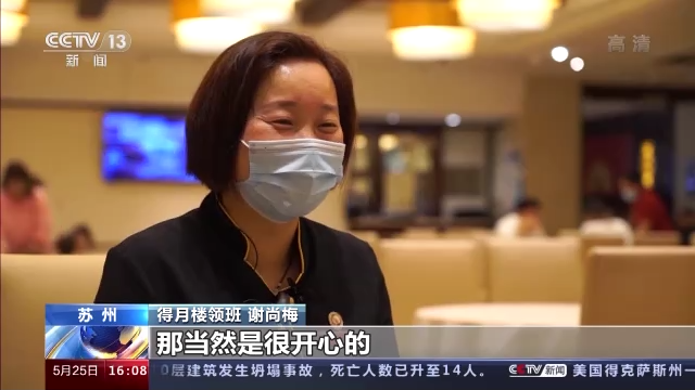 得月樓領(lǐng)班 謝尚梅:可以堂食可以上班了,當(dāng)然是很開心的。這樣的話就多一份收入了,多點(diǎn)收入開支上面也要富余一點(diǎn)。