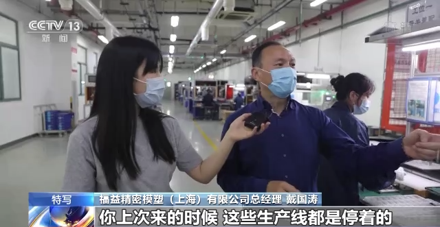 福益精密模塑(上海)有限公司總經(jīng)理 戴國(guó)濤:你上次來(lái)的時(shí)候這些生產(chǎn)線都是停著的,今天我們都已經(jīng)正常生產(chǎn)了。直到目前,我們是24小時(shí)開工在加足馬力,所有的情況都在往好的方向轉(zhuǎn)。