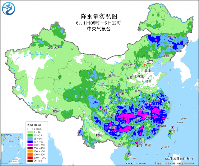 據(jù)統(tǒng)計,截至6月5日上午,貴州銅仁、湖南懷化和湘西及廣西桂林、柳州、河池等地最大累計降雨量達(dá)350~593毫米,貴州、湖南、江西、浙江、廣西、廣東等地個別站點(diǎn)日雨量達(dá)到特大暴雨量級(250~326毫米);上述部分地區(qū)出現(xiàn)短時強(qiáng)降水(最大小時降雨量30~70毫米,局地80毫米以上)、雷暴大風(fēng)等強(qiáng)對流天氣。