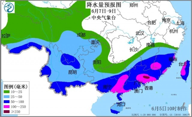 7日至9日,湖南南部、江西中南部、福建、廣西、廣東、海南、臺灣及四川中南部、云南、貴州西部等地部分地區(qū)將有大雨或暴雨,局地大暴雨。廣西東部、廣東西南部和中東部、福建西南部和東部沿海、臺灣西部等地部分地區(qū)降雨量可達(dá)100~180毫米,局地200~300毫米;上述地區(qū)還將伴有短時強(qiáng)降水(最大小時降雨量30~50毫米、局地70毫米以上)、雷暴大風(fēng)等強(qiáng)對流天氣。