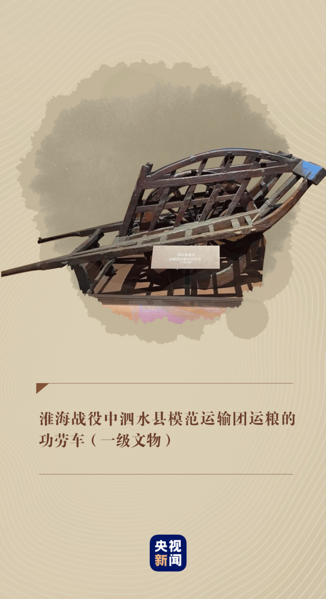 在中國共產(chǎn)黨歷史展覽館,靜臥著一輛淮海戰(zhàn)役中泗水縣模范運輸團(tuán)運糧的功勞車。它向人們講述著當(dāng)年硝煙彌漫的戰(zhàn)場上,人民群眾團(tuán)結(jié)一心,用一輛輛小車推出戰(zhàn)役勝利的感人故事。