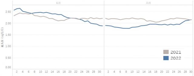 從價(jià)格走勢(shì)看(圖1),呈現(xiàn)三個(gè)特點(diǎn):一是整體處于低價(jià)區(qū)間。6月是我國(guó)露地蔬菜生產(chǎn)旺季,全國(guó)平均氣溫、平均降水量較常年同期偏高,平均日照時(shí)數(shù)較2021年偏多,整體有利于蔬菜生產(chǎn),供應(yīng)較為充足,月均地頭價(jià)環(huán)比、同比均呈下降態(tài)勢(shì)。二是月內(nèi)上旬呈下降趨勢(shì)。6月9日蔬菜地頭價(jià)1.78元/公斤,較月初1.90元/公斤下降了6.3%,跌至2022年以來(lái)的最低點(diǎn),比年內(nèi)最高價(jià)(4.21元/公斤)下降57.7%。三是中下旬價(jià)格止跌回升。經(jīng)歷6月10—16日和26—30日兩輪較大幅度上漲,月末價(jià)格達(dá)到2.16元/公斤,比6月9日價(jià)格上升了21.3%。上漲主要原因:一方面,黃淮海及環(huán)渤海等地區(qū)因持續(xù)高溫天氣,設(shè)施蔬菜提前拉秧,供應(yīng)量減少。另一方面,南方持續(xù)降雨影響蔬菜正常生長(zhǎng)和采收,江西、湖南、廣西、福建等省部分地區(qū)發(fā)生不同程度洪澇災(zāi)害,100多萬(wàn)畝蔬菜受災(zāi)。此外,受疫情影響的社會(huì)性消費(fèi)開(kāi)始復(fù)蘇,蔬菜需求量增加。