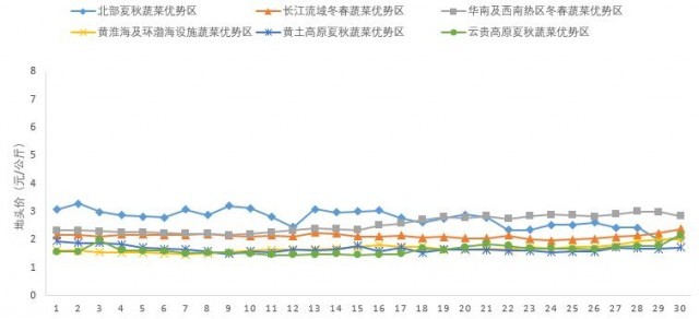 6月中后期地頭價(jià)從主產(chǎn)區(qū)看(圖2),除云貴高原夏秋蔬菜優(yōu)勢(shì)區(qū)月均地頭價(jià)環(huán)比持平外,其他優(yōu)勢(shì)區(qū)地頭價(jià)均有所下降,其中北部產(chǎn)區(qū)降幅相對(duì)較大。黃土高原夏秋蔬菜優(yōu)勢(shì)區(qū)、黃淮海及環(huán)渤海設(shè)施蔬菜優(yōu)勢(shì)區(qū)、北部夏秋蔬菜優(yōu)勢(shì)區(qū)、長(zhǎng)江流域冬春蔬菜優(yōu)勢(shì)區(qū)、華南及西南熱區(qū)冬春蔬菜優(yōu)勢(shì)區(qū)6月月均地頭價(jià)環(huán)比分別下降了31.7%、19.3%、18.5%、17.8%、6.6%。