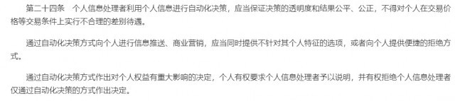 《中華人民共和國個人信息保護(hù)法》第24條明確規(guī)定了用戶對自動化決策的拒絕權(quán),即“通過自動化決策方式向個人進(jìn)行信息推送、商業(yè)營銷,應(yīng)當(dāng)同時提供不針對其個人特征的選項,或者向個人提供便捷的拒絕方式”。