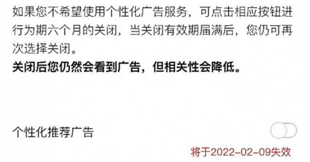 警惕用戶這種拒絕權(quán)流于形式,需要平臺自覺維護(hù)。記者通過對比發(fā)現(xiàn),在其他平臺個性化廣告設(shè)置端口,明顯提示“你可以開啟或關(guān)閉服務(wù),或管理廣告興趣標(biāo)簽。廣告總數(shù)不會因此變化?!币簿鸵馕吨鴮⑦x擇或拒絕權(quán)交到了用戶手中,雖然關(guān)閉后還是會接收到隨機(jī)推送的廣告,但這些廣告并非是針對用戶個人興趣點“計算”出來的。