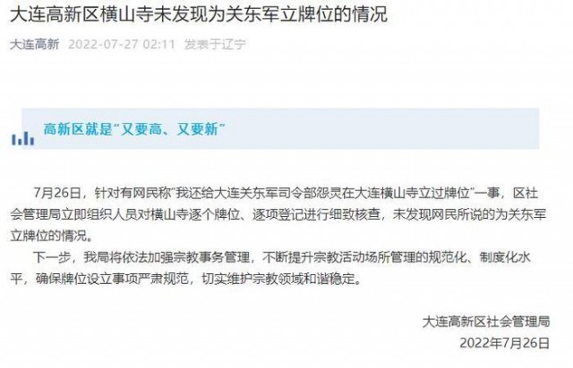 據(jù)大連高新微信公眾號消息, 7月26日,針對有網(wǎng)民稱“我還給大連關東軍司令部怨靈在大連橫山寺立過牌位”一事,區(qū)社會管理局立即組織人員對橫山寺逐個牌位、逐項登記進行細致核查,未發(fā)現(xiàn)網(wǎng)民所說的為關東軍立牌位的情況。