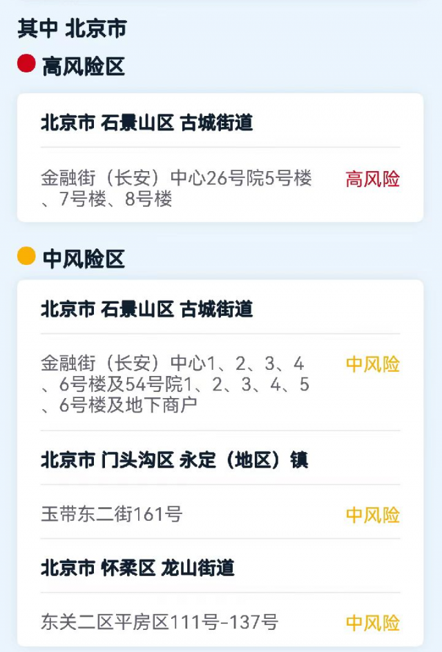 北京現(xiàn)有高、中風(fēng)險區(qū)1+3個