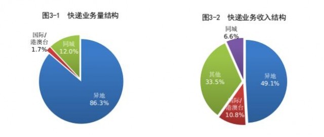 1-7月,同城、異地、國(guó)際/港澳臺(tái)快遞業(yè)務(wù)量分別占全部快遞業(yè)務(wù)量的12.0%、86.3%和1.7%;業(yè)務(wù)收入分別占全部快遞業(yè)務(wù)收入的6.6%、49.1%和10.8%。與去年同期相比,同城快遞業(yè)務(wù)量的比重下降1.2個(gè)百分點(diǎn),異地快遞業(yè)務(wù)量的比重上升1.6個(gè)百分點(diǎn),國(guó)際/港澳臺(tái)業(yè)務(wù)量的比重下降0.4個(gè)百分點(diǎn)。