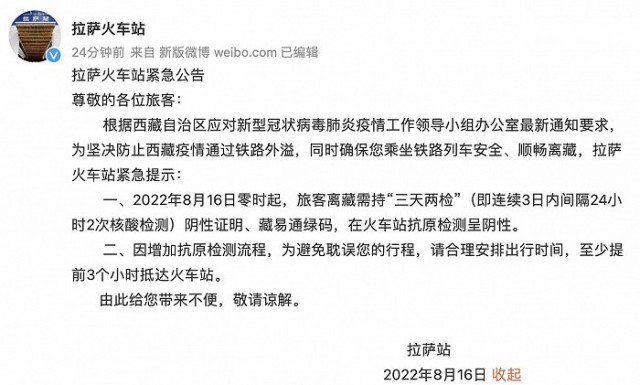 央視網(wǎng)消息:據(jù)@拉薩火車站 微博消息,根據(jù)西藏自治區(qū)應(yīng)對新型冠狀病毒肺炎疫情工作領(lǐng)導(dǎo)小組辦公室最新通知要求,為堅決防止西藏疫情通過鐵路外溢,同時確保您乘坐鐵路列車安全、順暢離藏,拉薩火車站緊急提示:8月16日零時起,旅客離藏需持“三天兩檢”(即連續(xù)3日內(nèi)間隔24小時2次核酸檢測)陰性證明、藏易通綠碼,在火車站抗原檢測呈陰性。因增加抗原檢測流程,請至少提前3個小時抵達火車站。