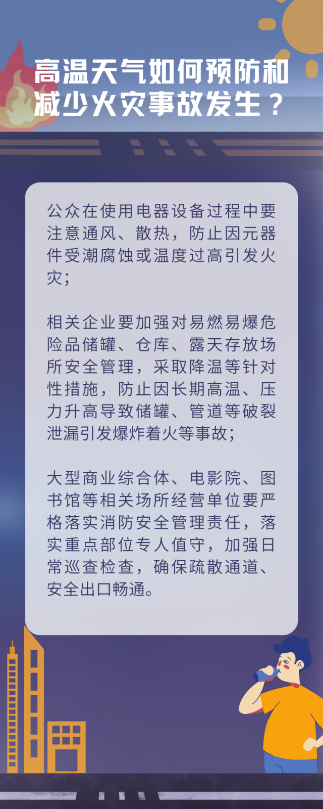 高溫天氣如何有效預(yù)防和減少火災(zāi)事故發(fā)生?應(yīng)急管理部消防救援局發(fā)布消防安全提示,公眾在使用電器設(shè)備過程中要注意通風、散熱,防止因元器件受潮腐蝕或溫度過高引發(fā)火災(zāi);相關(guān)企業(yè)要加強對易燃易爆危險品儲罐、倉庫、露天存放場所安全管理,采取降溫等針對性措施,防止因長期高溫、壓力升高導(dǎo)致儲罐、管道等破裂泄漏引發(fā)爆炸著火等事故;大型商業(yè)綜合體、電影院、圖書館等相關(guān)場所經(jīng)營單位要嚴格落實消防安全管理責任,落實重點部位專人值守,加強日常巡查檢查,確保疏散通道、安全出口暢通。
