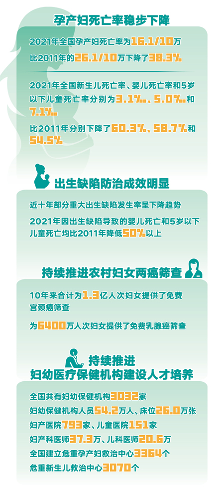 除了“兩癌”篩查,過去10年,我國婦幼健康保障水平整體取得了較大進(jìn)展。截至今年5月,全國共有婦幼保健機(jī)構(gòu)3032家,婦幼保健機(jī)構(gòu)專業(yè)人員54.2萬人,床位數(shù)26萬張。全國共有婦產(chǎn)醫(yī)院793家,兒童醫(yī)院151家,婦產(chǎn)科醫(yī)師37.3萬人,我國婦幼健康服務(wù)能力得到持續(xù)提升。