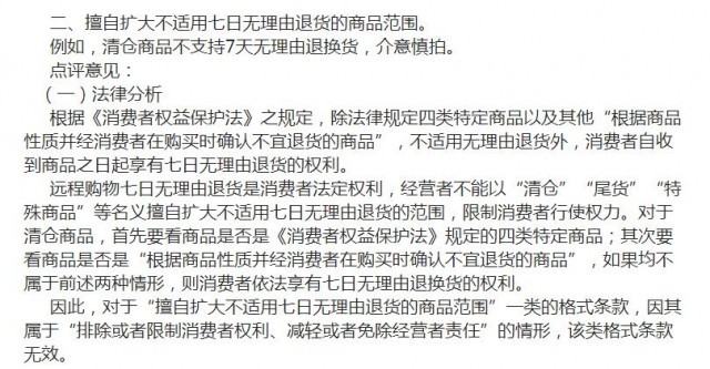 因此,對(duì)于“擅自擴(kuò)大不適用七日無(wú)理由退貨的商品范圍”一類的格式條款,因其屬于“排除或者限制消費(fèi)者權(quán)利、減輕或者免除經(jīng)營(yíng)者責(zé)任”的情形,該類格式條款無(wú)效。(中新財(cái)經(jīng))