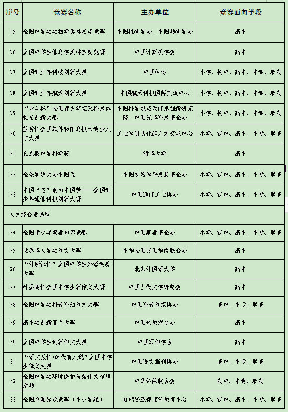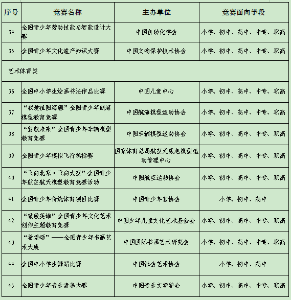 根據(jù)《教育部辦公廳等四部門關(guān)于印發(fā)<面向中小學生的全國性競賽活動管理辦法>的通知》精神,由主辦單位自主申報,經(jīng)組織專家進行嚴格評審把關(guān),擬確定全國青少年人工智能創(chuàng)新挑戰(zhàn)賽等45項競賽為2022-2025學年面向中小學生開展的全國性競賽活動,舉辦時間原則上為2022年9月至2025年8月,在此期間每學年舉辦不得超過1次,累計不超過3次?,F(xiàn)就相關(guān)信息予以公示,公示期為2022年8月23日至29日。