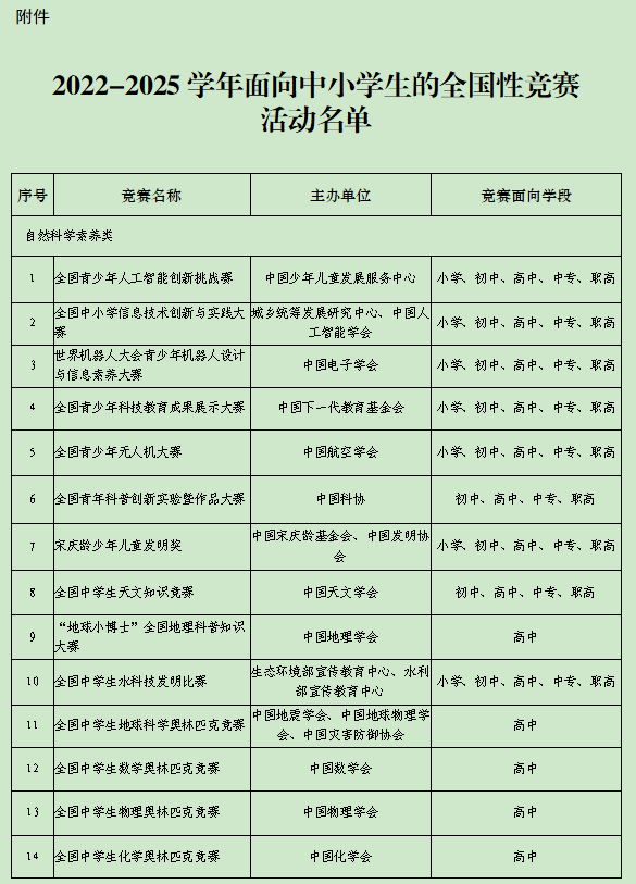 教育部辦公廳今天發(fā)布通知,公示2022-2025學年面向中小學生的全國性競賽活動名單。