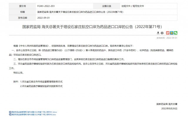 根據(jù)《中華人民共和國藥品管理法》,經(jīng)國務(wù)院批準(zhǔn),同意增設(shè)石家莊航空口岸為藥品進(jìn)口口岸?,F(xiàn)將有關(guān)事項公告如下: