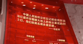 △“紀念中國人民志愿軍抗美援朝出國作戰(zhàn)70周年主題展覽”,紅色玻璃幕墻上鐫刻著抗美援朝英烈模范的姓名。