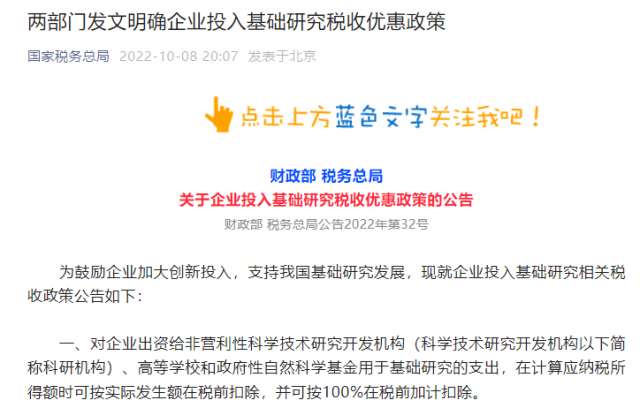為鼓勵(lì)企業(yè)加大創(chuàng)新投入,支持我國(guó)基礎(chǔ)研究發(fā)展,現(xiàn)就企業(yè)投入基礎(chǔ)研究相關(guān)稅收政策公告如下: