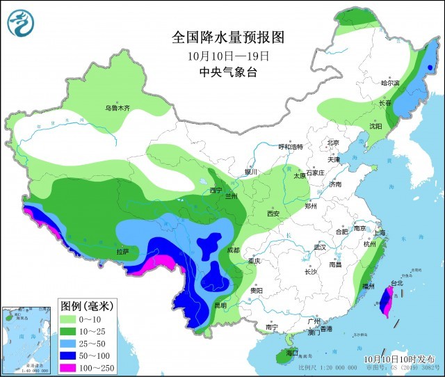 未來(lái)10天(10月10-19日),青藏高原東部和南部、四川盆地西部、云南西部和北部、貴州西北部、華南東部等地累計(jì)降水量有30~50毫米,部分地區(qū)有60~110毫米;上述地區(qū)累計(jì)降雨量較常年同期偏多5~8成,局地偏多1倍以上。黃淮、江淮、江南大部、華南大部多晴到多云天氣。