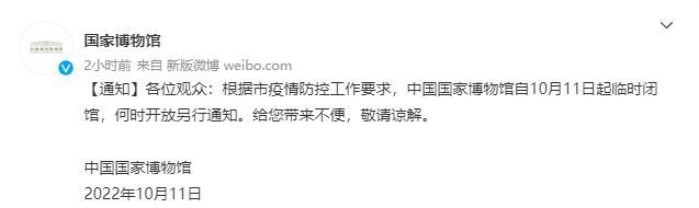 國(guó)家博物館10月10日發(fā)布通知稱,根據(jù)市疫情防控工作要求,中國(guó)國(guó)家博物館自10月11日起臨時(shí)閉館,何時(shí)開(kāi)放另行通知。給您帶來(lái)不便,敬請(qǐng)諒解。