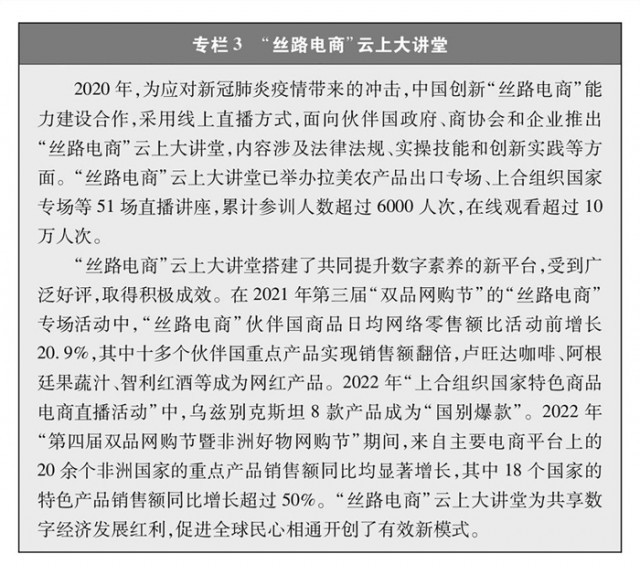 “絲路電商”合作成果豐碩。自2016年以來(lái),中國(guó)與五大洲23個(gè)國(guó)家建立雙邊電子商務(wù)合作機(jī)制,建立中國(guó)-中東歐國(guó)家、中國(guó)-中亞五國(guó)電子商務(wù)合作對(duì)話機(jī)制,通過(guò)政企對(duì)話、聯(lián)合研究、能力建設(shè)等推動(dòng)多層次交流合作,營(yíng)造良好發(fā)展環(huán)境,構(gòu)建數(shù)字合作格局。電子商務(wù)企業(yè)加速“出海”,帶動(dòng)跨境物流、移動(dòng)支付等各領(lǐng)域?qū)崿F(xiàn)全球發(fā)展。積極參與世界貿(mào)易組織、二十國(guó)集團(tuán)、亞太經(jīng)合組織、金磚國(guó)家、上合組織等多邊和區(qū)域貿(mào)易機(jī)制下的電子商務(wù)議題討論,與自貿(mào)伙伴共同構(gòu)建高水平數(shù)字經(jīng)濟(jì)規(guī)則。電子商務(wù)國(guó)際規(guī)則構(gòu)建取得突破,區(qū)域全面經(jīng)濟(jì)伙伴關(guān)系協(xié)定電子商務(wù)章節(jié)成為目前覆蓋區(qū)域最廣、內(nèi)容全面、水平較高的電子商務(wù)國(guó)際規(guī)則。