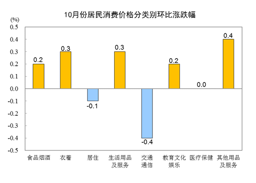 10月份,全國居民消費價格環(huán)比上漲0.1%。其中,城市持平,農(nóng)村上漲0.1%;食品價格上漲0.1%,非食品價格持平;消費品價格上漲0.1%,服務價格持平。