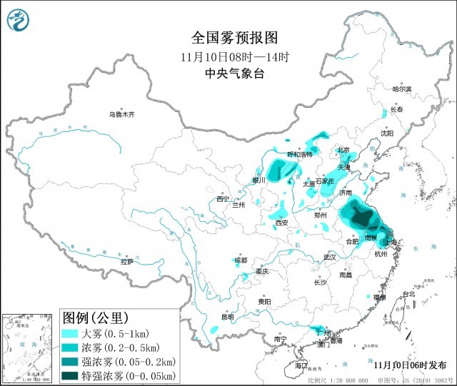 中央氣象臺今天早晨繼續(xù)發(fā)布大霧黃色預警:預計,11月10日早晨至上午,北京東部、天津、河北東北部和南部、山西東南部、山東西北部和南部、江蘇、安徽東部、上海、浙江北部以及陜西中北部、內蒙古河套地區(qū)等地的部分地區(qū)將有能見度不足1公里的大霧天氣,其中,天津南部、江蘇北部、安徽東北部、上海、浙江北部以及內蒙古河套地區(qū)等地的部分地區(qū)有能見度不足500米的濃霧,局地能見度不足50米。