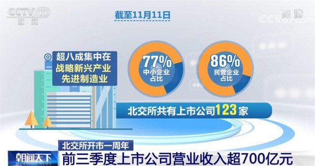 截至11月11日,北交所共有上市公司123家,其中,中小企業(yè)占比77%,民營企業(yè)占比86%,超八成集中在戰(zhàn)略新興產(chǎn)業(yè)、先進(jìn)制造業(yè);49家為國家級“專精特新”小巨人企業(yè),平均研發(fā)強(qiáng)度達(dá)5.4%,高于社會平均水平,創(chuàng)新特征鮮明。
