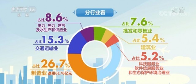 數(shù)據(jù)顯示,分行業(yè)看,制造業(yè)是受益最明顯的行業(yè),退稅6176億元,占比26.7%;交通運輸業(yè)占15.3%;電力、熱力、燃氣及水生產(chǎn)和供應(yīng)業(yè)、批發(fā)和零售業(yè)、建筑業(yè)、科技服務(wù)業(yè)、軟件信息服務(wù)業(yè)和生態(tài)保護環(huán)境治理業(yè)占比從8.6%到5.2%不等。
