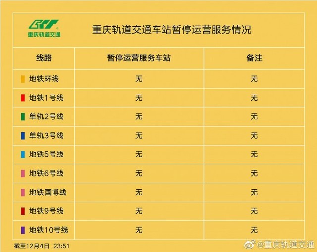 央視網(wǎng)消息:據(jù)@重慶軌道交通,12月5日06:30起,暫停運(yùn)營(yíng)服務(wù)的車(chē)站全部恢復(fù)運(yùn)營(yíng)服務(wù)。