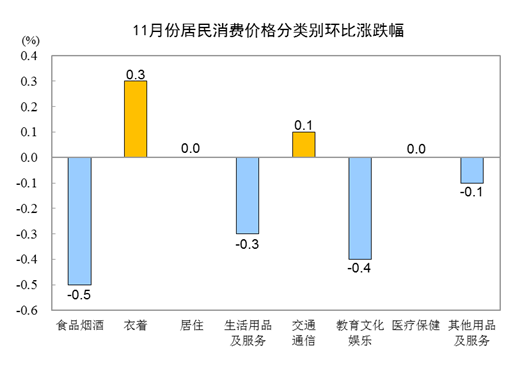 11月份,全國居民消費價格環(huán)比下降0.2%。其中,城市下降0.2%,農(nóng)村下降0.2%;食品價格下降0.8%,非食品價格持平;消費品價格下降0.1%,服務(wù)價格下降0.2%。