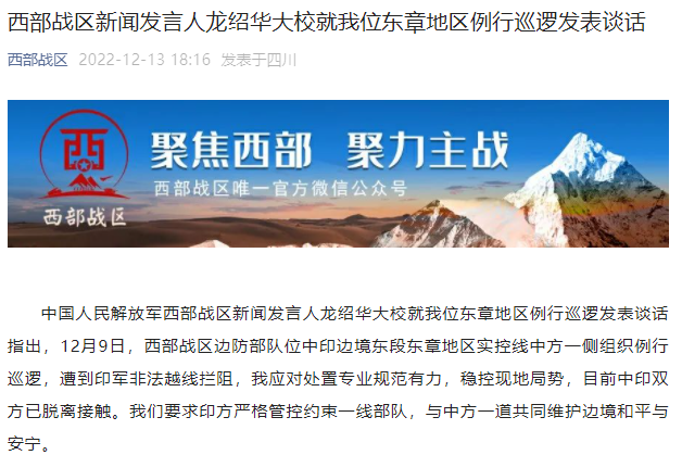 中國人民解放軍西部戰(zhàn)區(qū)新聞發(fā)言人龍紹華大校就我位東章地區(qū)例行巡邏發(fā)表談話指出,12月9日,西部戰(zhàn)區(qū)邊防部隊位中印邊境東段東章地區(qū)實控線中方一側(cè)組織例行巡邏,遭到印軍非法越線攔阻,我應(yīng)對處置專業(yè)規(guī)范有力,穩(wěn)控現(xiàn)地局勢,目前中印雙方已脫離接觸。我們要求印方嚴(yán)格管控約束一線部隊,與中方一道共同維護邊境和平與安寧。