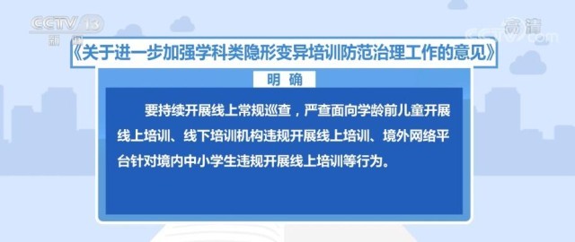 《意見》明確,要持續(xù)開展線上常規(guī)巡查,嚴(yán)查面向?qū)W齡前兒童開展線上培訓(xùn)、線下培訓(xùn)機(jī)構(gòu)違規(guī)開展線上培訓(xùn)、境外網(wǎng)絡(luò)平臺針對境內(nèi)中小學(xué)生違規(guī)開展線上培訓(xùn)等行為。