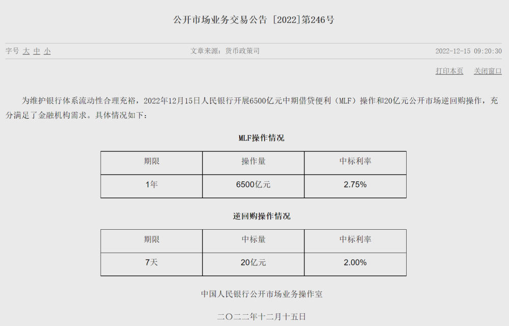 為維護(hù)銀行體系流動性合理充裕,12月15日中國人民銀行開展6500億元中期借貸便利(MLF)操作和20億元公開市場逆回購操作,充分滿足了金融機(jī)構(gòu)需求,中標(biāo)利率均與前次持平。