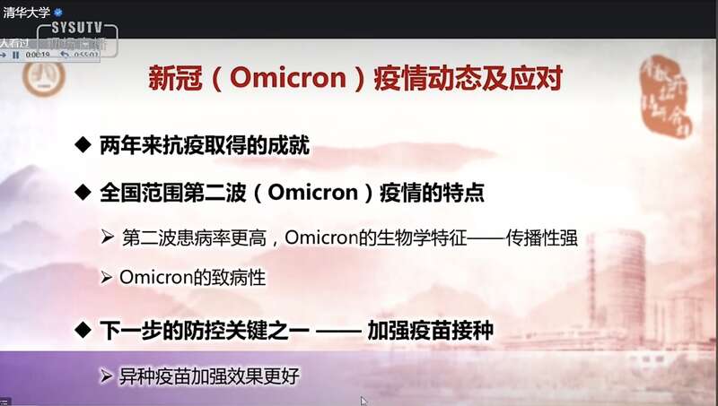 本次講座是“全國高校抗疫大講堂”的一次活動,由中山大學、北京大學、清華大學共同主辦。鐘南山系統(tǒng)分析了全國范圍第二波奧密克戎疫情的特點,介紹了奧密克戎的生物學特征、致病性,以及在大學教學環(huán)境中如何讓學生加強個人防護,青年人如何應對新冠,加強個人防護的8條建議等。