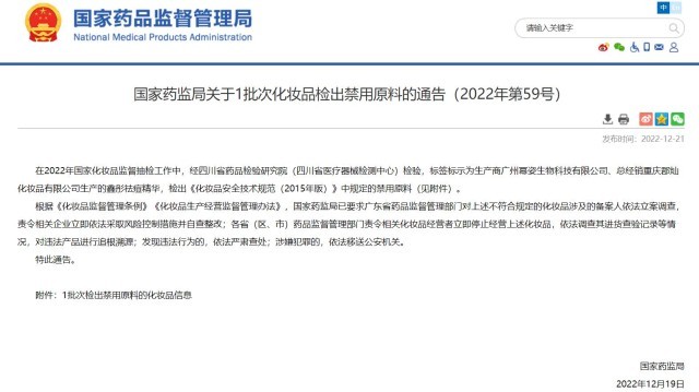 國(guó)家藥監(jiān)局官網(wǎng)消息,在2022年國(guó)家化妝品監(jiān)督抽檢工作中,經(jīng)四川省藥品檢驗(yàn)研究院(四川省醫(yī)療器械檢測(cè)中心)檢驗(yàn),標(biāo)簽標(biāo)示為生產(chǎn)商廣州冪姿生物科技有限公司、總經(jīng)銷(xiāo)重慶郡燦化妝品有限公司生產(chǎn)的鑫彤祛痘精華,檢出《化妝品安全技術(shù)規(guī)范(2015年版)》中規(guī)定的禁用原料。