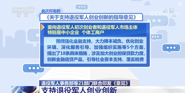此次印發(fā)的《關(guān)于支持退役軍人創(chuàng)業(yè)創(chuàng)新的指導(dǎo)意見》,面向退役軍人初次創(chuàng)業(yè)者和退役軍人市場(chǎng)主體,特別是中小企業(yè)、個(gè)體工商戶。圍繞強(qiáng)化金融支持、大力降本減負(fù)、優(yōu)化創(chuàng)業(yè)環(huán)境、深化服務(wù)引導(dǎo)、加強(qiáng)組織實(shí)施等5個(gè)方面,提出了18條具體措施,涉及加大創(chuàng)業(yè)擔(dān)保貸款力度、創(chuàng)新金融信貸產(chǎn)品、引導(dǎo)社會(huì)資本支持、落實(shí)稅費(fèi)減免、緩解租金壓力、優(yōu)化供地保障、落實(shí)補(bǔ)貼優(yōu)惠、完善公共服務(wù)、開展創(chuàng)業(yè)培訓(xùn)、加強(qiáng)個(gè)體工商戶引導(dǎo)扶持等,進(jìn)一步提升退役軍人創(chuàng)業(yè)創(chuàng)新能力,培育壯大退役軍人市場(chǎng)主體,帶動(dòng)更多退役軍人就業(yè)。