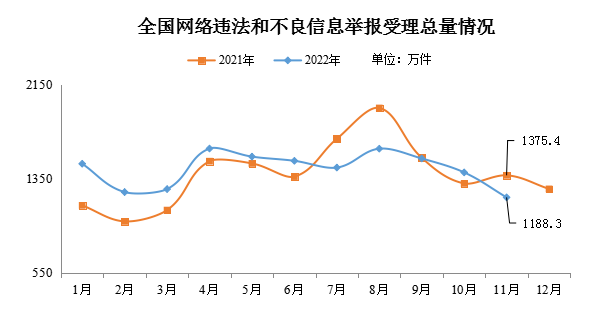 中央網(wǎng)信辦舉報中心近日公布的統(tǒng)計數(shù)據(jù)顯示,2022年11月,中央網(wǎng)信辦舉報中心指導(dǎo)全國各級網(wǎng)信舉報工作部門、主要網(wǎng)站平臺受理舉報1188.3萬件,環(huán)比下降15.1%、同比下降13.6%。