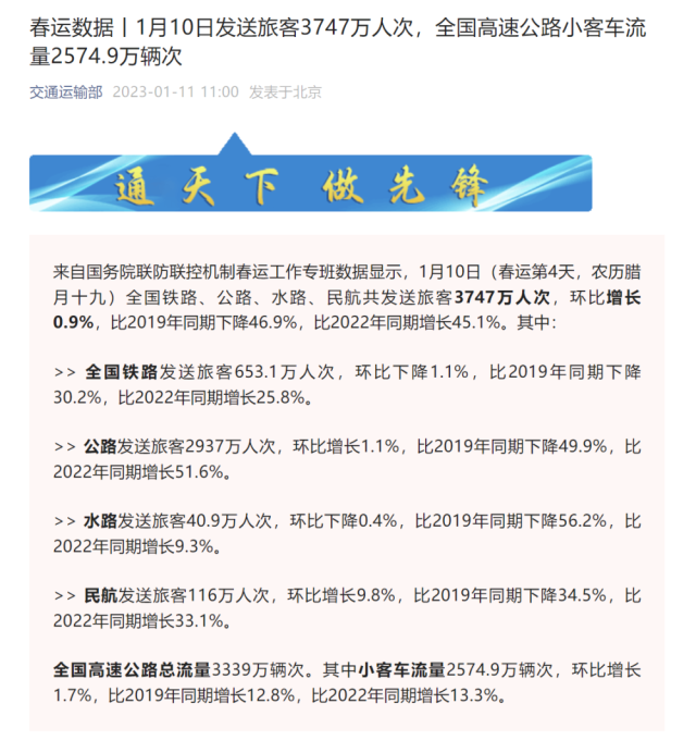 來自國務(wù)院聯(lián)防聯(lián)控機制春運工作專班數(shù)據(jù)顯示,1月10日(春運第4天,農(nóng)歷臘月十九)全國鐵路、公路、水路、民航共發(fā)送旅客3747萬人次,環(huán)比增長0.9%,比2019年同期下降46.9%,比2022年同期增長45.1%。其中: